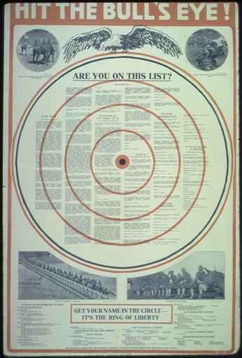 Keywords: "Hit The Bull's Eye^ Are You on This List^ Get Your Name in the Circle- it's The Ring of Liberty.", ca. 1917 - ca. 1919 - NARA - 512467.jpg Scope and content General notes 512467 Local identifier 4-P-28 U S Food Administration Educational Division Advertising Section 01/15/1918 - 01/1919 Still Picture Records Section Special Media Archives Services Division NWCS-S National Archives at College Park 8601 Adelphi Road College Park MD 20740-6001 other date circa 1917 1919 Record group Record Group 4 Records of the U S Food Administration 1917 - 1920 Record group ARC 333 World War I Posters compiled 1917 - 1919 Series ARC 512439 File unit File unit ARC Variant control numbers NAIL Control Number NWDNS-4-P-28 Other versions <gallery> File Hit_The_Bull's_Eye _Are_You_on_This_List _Get_Your_Name_in_the_Circle-_it's_The_Ring_of_Liberty _ca _1917_-_ca _1919_-_NARA_-_512467 tif tif File Hit_The_Bull's_Eye _Are_You_on_This_List _Get_Your_Name_in_the_Circle-_it's_The_Ring_of_Liberty _ca _1917_-_ca _1919_-_NARA_-_512467 jpg jpg </gallery> NARA-cooperation PD-USGov World War I posters of the United States Propaganda of advertising sections of the United States |