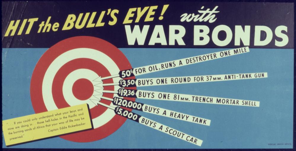 Keywords: Hit the Bull's Eye with War Bonds - NARA - 534011.jpg Scope and content General notes 534011 Local identifier 179-WP-154 Office for Emergency Management War Production Board 01/1942 - 11/03/1945 Still Picture Records Section Special Media Archives Services Division NWCS-S National Archives at College Park 8601 Adelphi Road College Park MD 20740-6001 other date circa 1942 1943 Record group Record Group 179 Records of the War Production Board 1918 - 1947 Record group ARC 508 War Production Board compiled 1942 - 1943 Series ARC 533858 File unit File unit ARC Variant control numbers NAIL Control Number NWDNS-179-WP-154 Other versions <gallery> File Hit_the_Bull's_Eye_with_War_Bonds_-_NARA_-_534011 tif tif File Hit_the_Bull's_Eye_with_War_Bonds_-_NARA_-_534011 jpg jpg </gallery> NARA-cooperation PD-USGov World War II posters from the United States |