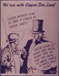 Keywords: "Hit'em With Copper, Zinc, Lead" - NARA - 514501.jpg Scope and content General notes 514501 Local identifier 44-PA-994 Office for Emergency Management Office of War Information Domestic Operations Branch Bureau of Special Services 03/09/1943 - 09/15/1945 Still Picture Records Section Special Media Archives Services Division NWCS-S National Archives at College Park 8601 Adelphi Road College Park MD 20740-6001 1941 - 1945 Record group Record Group 44 Records of the Office of Government Reports 1932 - 1947 Record group ARC 373 World War II Posters compiled 1942 - 1945 Series ARC 513498 File unit File unit ARC Variant control numbers NAIL Control Number NWDNS-44-PA-994 Other versions <gallery> File Hit'em_With_Copper _Zinc _Lead _-_NARA_-_514501 tif tif File Hit'em_With_Copper _Zinc _Lead _-_NARA_-_514501 jpg jpg </gallery> NARA-cooperation PD-USGov World War II posters from the United States Uncle Sam in propaganda |