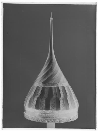 Keywords: Hjälm - Livrustkammaren - 68489-negative.tif LSH artwork sv Spetsig hjälm med oval klocka invändigt klätt med stoppning av rött atlassiden med dekorsömmar i fiskbensmönster Utvändig dekor Nertill en ca 15 mm bred ring av förgylld mässing med höga skarpa kanter och därinnanför pärlstavskantbårder omgivande en bladbård i mitten Ringen fäst med 15 nitar med kulformiga huvuden varav fyra återstår Därovanför två skålade band i stålet b ca 15 mm det övre helt täckt av påslagen rankdekor av guld på det nedre samma dekor i fyra fält med rundade ändar Därovanför smalnar hjälmklockan av uppåt Därpå ett 90 mm brett dekorband sammansatt av ca 15 mm breda stavar i två rader med sicksackformig avgränsning mellan raderna så att den övre raden är halvt förskjuten i förhållande till den nedre På två angränsande stavar i de två raderna dekor som tidigare Därovanför en skålad ring med rankdekor Hjälmklockans övre del dekorerad med 18 spiralvridna skålade fält vartannat med gulddekor Överst en ca 35 mm bred ring med gulddekor avslutad vid spetsskarven Spets l 155 mm d nertill 19 mm och avsmalnande uppåt avslutning upptill med en fasetterad kula med skålade fördjupningar c ca 10 mm och därovanför en något böjd spets l 22 mm Nedanför kulan ett mycket slitet fält med gulddekor original caption hjälm - LRK 20388 Erövringen av Warszawa Stora oredan<br/> Stora oredan Moskwa mid other date century 16 steel - brass - gold size mm 220 största g 1280 size mm 210 minsta size mm 410 LRK Karl XI av Sverige Persisk konst i Sverige 1973 Livrustkammarens basutställning 1978 Gustav II Adolf 350 år efter Lützen 1982-1984 Islamiskt i de kungliga samlingarna 1984 Kungens lockpipa 1995-1996 Karl XII och Peter den store 1998-1999 Krigsbyte 2007-2008 Basutställning Basutställning place of origin original filename LN_A00038_000038 56956 inventory number LRK 20388 68489 CC0 Hjälm - Livrustkammaren - 68489 tif <gallery caption Different images of same object > File Hjälm Oruzejnaja Palata - Livrustkammaren - 42898 tif </gallery> |