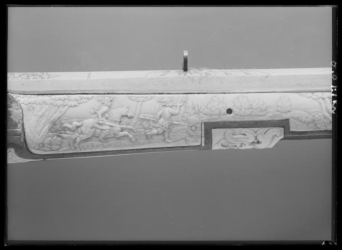 Keywords: Hjullåsstudsare, Westphalen cirka 1660 - Livrustkammaren - 27629.tif LSH artwork sv Åttsidig sjuräfflad pipa bombredd 2 8 mm Rektangulärt svansskruvblad På kammaren en sköldformig stämpel med hand och därovanför tre otydliga bokstäver G H N LRK vägl 1921 155 Dekor i form av graverade blomrankor på kammaren runt siktet och bakom kornet På kammaren dessutom ett fält med landskap med en man och fyra springande hundar Riktmedel Ståndsikte av stål med bred u-formig skärm Spolformigt korn av mässing båda inlaxade Fästning Pipan fäst med krysskruv underifrån främre varbygelskruven samt tre pipstift av trä Hjullås av tysk typ plant låsbleck l 205 mm Dekor i form av graverade blomrankor i låg relief mot mörkskrafferad bakgrund Bakom hjulet ett ovalt fält med landskap däri ryttare som förföljer en springande hjort två hundar Utanpåliggande hjul fäst med halvcirkelformig uppåt breddad ring fäst med två skruvar kl 3 och 9 Svängd eldskärm avslutad med horisontell hjärtformig spets Fängpannelock med rörlig arm lockets framkant fasad och försedd med graverad dekor svängt rundat fingergrepp framtill avslutat med ett treflikigt blad Hane med fyrsidig kropp med rundad räfflad utsida ringformig hanhals med stor skärm lös överkäke Hals och käkar graverade som fågelhuvuden Uppåtböjt fingergrepp avslutat med en rund platt med spiralgravering Käkskruv med fyrsidigt huvud upptill koniskt med kulformig avslutning Hanfjäder med fasade kanter konturerad studel med glasögonformig genombrytning Avtryckarstången och fängpannelockets stoppfjädrar blånerade Fästning Två låsskruvar Avtryckare med konturerat och profilerat snälltryck Helstock av rödmålat trä rödbok nästan helt täckt med elfenbensplattor med snidad dekor Kolv av tysk typ med kolvlåda och vinge framtill avslutad med volut Den snidade dekoren föreställer landskap med jaktscener se Hellner Kolvlådelock av elfenben Kolvkula av stål Spetsrörka av elfenben med maskaron Topprörka och näsband samt bakplåten saknas Bred varbygel av stål med tre fingerlägen korta genombrutna armar på bygeln graverad rankdekor samt ovalt fält med landskap med jägare hund och hjort Tillbehör Laddstock av rödmålat trä l 742 mm i ena änden ett invändigt gängat stålrör l 119 mm Gåva till Karl XI från landshövdingen friherre Augustin Leijonsköld 1634-1682 original caption ca 1660 ivory e8 - eldvapen - stockdekor material elfenben - steel e1247 - eldvapen - pipa lås riktmedel och beslag material stål - brass e4 - eldvapen - riktmedel material mässing - beech e3 - eldvapen - stock material rödbok size mm 775 pipa size mm 1068 g 4430 LRK Karl XI av Sverige Augustin Leijonsköld Jakt 1973 Läckö slott Tre Karlar 1984-1985 Trofast - hov och tass i kunglig tjänst 2010-2011 Livrustkammaren Trogna vänner - Kungliga hästar och hundar 2011-2012 Museiverket/Finlands nationalmuseum basutställning G H N hand 1921 155 anv e1 - eldvapen - pipa; anonym pipsmed place of origin original filename LN_B16583_019463 39529 inventory number LRK 2919 27629 CC0 Hjullåsstudsare Westphalen cirka 1660 - Livrustkammaren - 27629-negative tif <gallery caption Different images of same object > File Bössa elfenben - Livrustkammaren - 86497 tif File Hjullåsstudsare Westphalen cirka 1660 - Livrustkammaren - 19075 tif File Hjullåsstudsare Westphalen cirka 1660 - Livrustkammaren - 19100 tif File Hjullåsstudsare Westphalen cirka 1660 - Livrustkammaren - 36190 tif File Hjullåsstudsare Westphalen cirka 1660 - Livrustkammaren - 10505 tif File Hjullåsstudsare - Livrustkammaren - 95342 tif File Hjullåsstudsare Westphalen cirka 1660 - Livrustkammaren - 53308 tif File Hjullåsstudsare Westphalen cirka 1660 - Livrustkammaren - 19067 tif File Hjullåsstudsare Westphalen cirka 1660 - Livrustkammaren - 44747 tif File Hjullåsstudsare Westphalen cirka 1660 - Livrustkammaren - 61869 tif File Hjullåsstudsare Westphalen cirka 1660 - Livrustkammaren - 44748 tif File Hjullåsstudsare Westphalen cirka 1660 - Livrustkammaren - 10538 tif File Hjullåsstudsare Westphalen cirka 1660 - Livrustkammaren - 1978 tif File Bössa elfenben - Livrustkammaren - 86498 tif </gallery> Muskets Media contributed by LSH dim-with multiple size templates Media contributed by LSH 2016-12 |