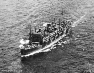 Keywords: HMAS Manoora (AWM 300984).jpg AWM Caption BRISBANE QLD C 1944 AERIAL PORT BOW VIEW OF THE LANDING SHIP INFANTRY LARGE HMAS MANOORA LANDING CRAFT VEHICLE PERSONNEL ARE CARRIED IN DAVITS ALONG THE SHIP'S SIDE IN THE WELL DECK FORWARD BETWEEN THE BRIDGE AND FUNNEL AND IMMEDIATELY ABAFT THE SUPERSTRUCTURE AN UNSHIELDED 6 INCH GUN IS MOUNTED AFT A 3 INCH AA GUN IS MOUNTED ABREAST THE FUNNEL EIGHT SINGLE 20 MM OERLIKON ANTI AIRCRAFT GUNS ARE MOUNTED BESIDE THE BRIDGE AND ON THE AFTER SUPERSTRUCTURE TYPE 271 RADAR IS FITTED AT THE BACK OF THE BRIDGE THE SHIP IS PAINTED IN ALL OVER DARK GREY CAMOUFLAGE SCHEME 300984 NAVAL HISTORICAL COLLECTION ~ 1944 US Navy Copyright expired - public domain PD-USGov HMAS Manoora F48 Black and white photographs |