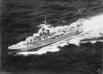 Keywords: HMAS Queenborough (AWM 301220).jpg AWM Caption c1954-03 Aerial port bow view of the former destroyer HMAS Queenborough F02 after her conversion to an anti submarine frigate Externally her destroyer origins are indicated only by her funnel and hull as all superstructure above the upper deck has been replaced The ship's new armament consists of a twin 40 mm Bofors mark 5 AA mounting forward and 4 inch mark 16 guns in a twin mark 19 mounting aft Note the launching rails for flare rockets fitted to the side of the mounting Two Limbo anti submarine mortars and their magazines are fitted in an echelon arrangement aft A type 277 height finding radar is fitted just above the bridge Type 293q air surface search and type 974 navigation radars are fitted to the foremast The ship has not yet been commissioned as she is flying no ensign and her close range blind fire director has not yet been fitted She is probably running speed trials Naval Historical Collection 301220 <br/>http //www awm gov au/database/collection asp; March 1954; 2007-04-01 Nick-D wikipedia en The AWM record for this photo states that the copyright status is 'clear' PD-AUSTRALIA PD-Australia original upload log page en wikipedia HMAS_Queenborough_ 28AWM_301220 29 jpg 2007-04-01 06 08 Nick-D 450×322× 57344 bytes <nowiki>Australian War Memorial AWM catalog number 301220 Sourced from http //www awm gov au/database/collection asp Copyright The AWM record for this photo states that the copyright status is 'clear' The photo was taken in 1954 The AWM allow</nowiki> DEFAULTSORT Queenborough Q and R class destroyer Aerial photographs of naval ships of Australia Queenborough Type 15 frigates Black and white photographs |