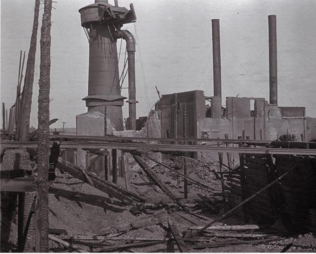 Keywords: fires ruins iron works ironworks 1900s chimneys outdoor "Iron Works fire" The ruins of the iron works in Deseronto, Ontario, after the fire which destroyed the building in September 1908. The blast furnace is clearly visible in the centre of the picture. "Iron Works fire" The ruins of the iron works in Deseronto, Ontario, after the fire which destroyed the building in September 1908. The blast furnace is clearly visible in the centre of the picture. |