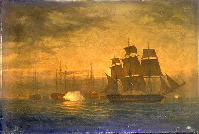 | Keywords: HMS Clyde escapes.jpg  en Escape of HMS 'Clyde' from the Nore mutiny 30 May 1797 The 'Clyde' in starboard-broadside view is sailing on the starboard tack and occupying the right-hand side of the picture Beyond her stern and to the left is the 'Sandwich' port-quarter view with the red flag of mutiny at her main and her riding lights lit To the left of the 'Sandwich' in starboard-quarter view is a two-decker firing one of her after upper-deck guns Other ships lie at anchor beyond her and in the right background under 'Clyde's' jib-boom is a frigate firing a gun from her port tier The painting is one of two commemorating the Clyde's escape from the Nore under her captain Charles Cunningham The second shows her arriving at Sheerness the following morning http //www nmm ac uk/collections/displayRepro cfm reproID BHC0496 picture 1 content Collections of the National Maritime Museum William Joy 1830 PD-old Sailing ships of the Royal Navy 19th-century sailing ships in paintings Ships under sail |