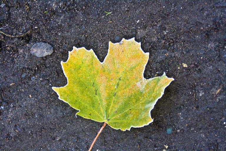 Keywords: hoarfrost autumn leaves maple red yellow frozen frost november