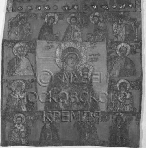 | Keywords: Hodegitria by Maria of Tver's workshop (1462-1467, Kremlin museum).jpg Пелена Богомате ь Одигит ия Смоленская ; Деисус и изб анные святые Россия осква 1462-1467 асте ская великой княгини а ии Бо исовны камка - Италия XV в узо ный атлас - иност анное п оизводство XVI в Камка узо ный атлас к ашенина газ нити золотные нити шелковые медь Ткачество шитье тиснение золочение Разме ы 47 0 х 43 0 см Публикации аясова А Д евне усское лицевое шитье Каталог - 2004 http //imagesgallery kreml ru/kse2/item seam type CRITERIA pos 50 1462 1467 Workship of Grand Duchess Maria Borisovna PD-Old Maria Borisovna of Tver Orthodox textiles in the Museums of Moscow Kremlin Embroidery of Russian tsarinas and Grand Duchess Files uploaded by Shakko from various sources |