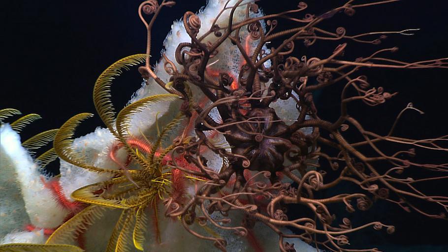 | Keywords: Deep-sea corals and sponges provide habitat and refuge for many other animals living on or near the seafloor. Here, a sponge covered with hundreds to thousands of tiny anemones also provides a home to several brittlestars (pink), crinoids or “sea lilies” (yellow), and a basket star (brown). worldheritagesite noaa okeanos leg2 northwesternhawaiianislands okeanosexplorer oceanexploration papahanaumokuakea papahānaumokuākea marinenationalmonument hawaiihawai‘i 2015hohonumoana | ||||
