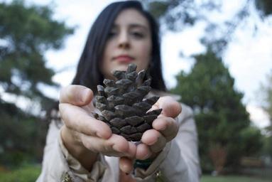 Keywords: holding pinecone woman hold pine female macro