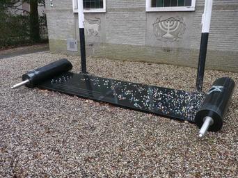 Keywords: Holocaustmonument - Tirza Verrips (Apeldoorn).jpg nl Holocaustmonument door de Apeldoornse kunstenaar Tirza Verrips voor de synagoge Een granieten Torarol met daarop knikkers 13 grote knikkers die staan voor de 13 mensen die op 9 oktober 1941 zijn afgevoerd naar de concentratiekampen In totaal zijn het 592 knikkers één voor elke Apeldoorner die in de Tweede Wereldoorlog is afgevoerd en vermoord in de concentratiekampen <br/> Het is dan alleen de vraag hoe het zit met de ongeveer 1500 mensen patiënten en personeel van de Joodse psychiatrische inrichting 'Het Apeldoornsche Bosch' die in WO II zijn gedeporteerd naar Auschwitz-Birkenau op 21 januari 1943 Zouden die niet meegeteld zijn own Erik Wannee 2011-02-24 Paslaan Apeldoorn NL 2958 Cc-zero World War II memorials in Apeldoorn Holocaust memorials in the Netherlands Tirza Verrips Synagogue Apeldoorn Torah scrolls Lion of Judah on Jewish gravestones Menorah on Jewish gravestones Symbols on Jewish gravestones Pebbles on Jewish gravestones Star of David on Jewish gravestones |