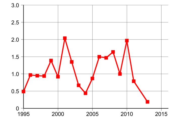 Keywords: Homicide Rate in Luxembourg.svg en Homicide rate per 100 000 in Luxembourg Data taken from http //www indexmundi com/facts/luxembourg/homicide-rate 2016-08-17 own Delphi234 other versions current annually Generated with Wikimedia SVG Chart SVG Chart/box cc-zero Homicide rates Crime in Luxembourg Diagrams labelled with numbers only |