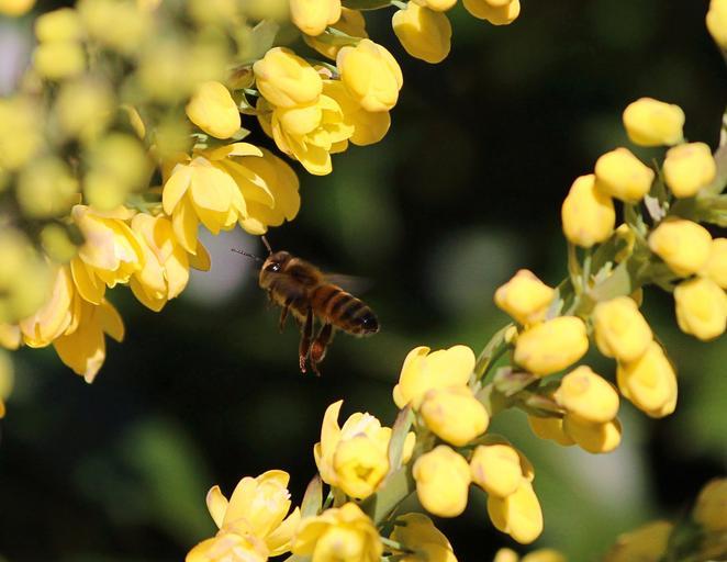 Keywords: honey bee flying yellow flowers string nectar pollinate buzz