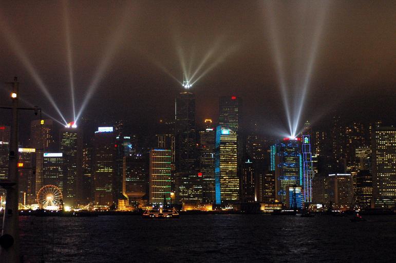 Keywords: hong kong victoria harbor carnival laser show lights cityscape night skyscrapers urban downtown port asian architecture harbor
