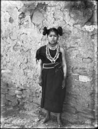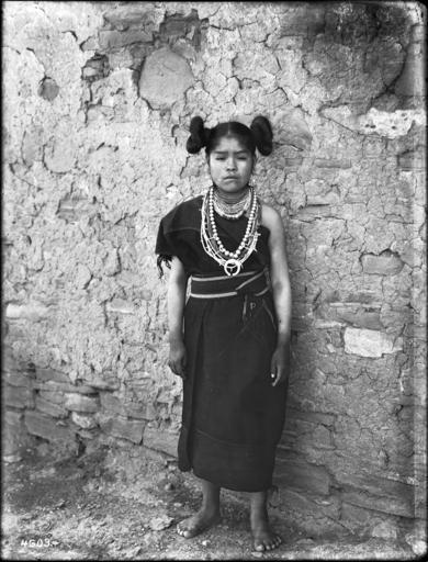 | Keywords: Hopi maiden wearing rich silver jewelry and wampum, Arizona, 1898 (CHS-4603).jpg  en <br> Hopi maiden wearing rich silver jewelry and wampum Arizona 1898 Photograph of a Hopi maiden wearing rich silver jewelry and wampum Arizona 1898 She is wearing a dress with only one shoulder with narrow sash around her waist Several necklaces hang around her neck She is barefoot Her hair is parted in the middle drawn into flat buns on each side of her head She stands with her back to an adobe and stone wall Call number CHS-4603 Photographer James George Wharton Filename CHS-4603 Coverage date 1898 Part of collection California Historical Society Collection 1860-1960 Format glass plate negatives Type images Part of subcollection Title Insurance and Trust and C C Pierce Photography Collection 1860-1960 Repository name USC Libraries Special Collections Accession number 4603 Archival file chs_Volume96/CHS-4603 tiff Repository address Doheny Memorial Library Los Angeles CA 90089-0189 Geographic subject country USA Format aacr2 2 photographs glass photonegative photoprint b w ; 22 x 17 cm Rights Digitally reproduced by the USC Digital Library; From the California Historical Society Collection at the University of Southern California Subject adlf tribal areas Project USC Repository email specol usc edu Identifying number unidentified no James-102 Contributing entity California Historical Society Date created 1898 Publisher of the digital version University of Southern California Libraries Format aat photographic prints; photographs Geographic subject state Arizona Legacy record ID chs-m16931; USC-1-1-1-13518 Access conditions Send requests to address or e-mail given Phone 213 821-2366; fax 213 740-2343 Subject file heading Indians -- Hopi Subject lcsh Indians of North America; Hopi Indians Subject Hopi Indians 1898 date created George Wharton James 1858 1923 http //digitallibrary usc edu/cdm/ref/collection/p15799coll65/id/16851 PD-old-70-1923 Images from USC Digital Library uploaded by Fæ Photographs by George Wharton James California Historical Society Collection 1860-1960 Glass plate negatives Hopi women |