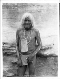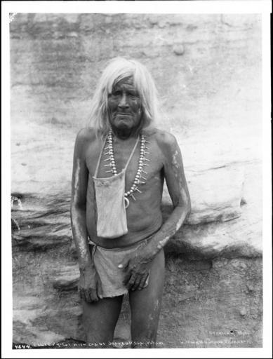 | Keywords: Hopi Priest with bag of sacred meal for the Flute Dance Ceremony at the pueblo of Walpi, Arizona, ca.1898 (CHS-4644).jpg en <br> Hopi Priest with bag of sacred meal for the Flute Dance Ceremony at the pueblo of Walpi Arizona ca 1898 Photograph of a Hopi Priest with bag of sacred meal slung from his neck for the Flute Dance Ceremony at the pueblo of Walpi Arizona ca 1898 He wears only a loin cloth and a silver necklace His arms are decorated in white paint or dried mud He has straight white hair hanging to his shoulders A rocky wall is behind him Call number CHS-4644 Legacy record ID chs-m16969; USC-1-1-1-13885 Photographer James George Wharton Filename CHS-4644 Coverage date circa 1898 Part of collection California Historical Society Collection 1860-1960 Type images Geographic subject city or populated place Walpi Repository name USC Libraries Special Collections Accession number 4644 Microfiche number 1-162- Archival file chs_Volume97/CHS-4644 tiff Part of subcollection Title Insurance and Trust and C C Pierce Photography Collection 1860-1960 Repository address Doheny Memorial Library Los Angeles CA 90089-0189 Geographic subject country USA Format aacr2 3 photographs glass photonegative photoprints b w ; 22 x 17 cm 26 x 21 cm Rights Digitally reproduced by the USC Digital Library; From the California Historical Society Collection at the University of Southern California Subject adlf religious facilities Project USC Repository email specol usc edu Identifying number unidentified no James-305 Contributing entity California Historical Society Date created circa 1898 Publisher of the digital version University of Southern California Libraries Format aat photographic prints; photographs Geographic subject state Arizona Subject file heading Indians -- Hopi -- Flute Dance Geographic coordinates -110 397217 35 832218 Format glass plate negatives Access conditions Send requests to address or e-mail given Phone 213 821-2366; fax 213 740-2343 Geographic subject county Navajo Subject lcsh Indians of North America; Hopi Indians; Dance; Rites and ceremonies Subject Hopi Indians; Hopi Flute Ceremony circa 1898 date created George Wharton James 1858 1923 http //digitallibrary usc edu/cdm/ref/collection/p15799coll65/id/16888 PD-old-70-1923 Images from USC Digital Library uploaded by Fæ Photographs by George Wharton James California Historical Society Collection 1860-1960 Glass plate negatives Hopi men |