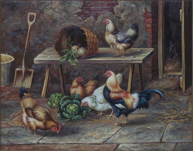 Keywords: Hoppe 001.JPG en The chicken family oil painting on canvas 50 x 61 cm by Jenny Hoppe 1870-1934 ; private collection own - photo made at an art auction in Belgium JoJan - artwork by Jenny Hoppe 2010-07-11 PD-Old cc-by-3 0 Jenny Hoppe