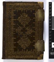 Keywords: HORae beatæ Mariæ virginis, et alia officia, scil.- Calendar, in French, f. 3; Commemoratio S. Anthonii, f. 16; Cursus Evangelii, f. 17 b; Commemorationes Sanctorum, f. 25; Horæ beatæ -Mariæ - Upper cover (Add Ms 23145).jpg Style Quadrilobe; Caption Upper cover; Colour Unspecified; Edge Unspecified exhibition history Decorative Technique Tooled in gold; Cover Material Goatskin includes morocco turkey etc Possibly English Two clasps catching on to the lower cover Metal cornerpieces with illuminated miniatures and initials On f 44 are inserted the arms of Bersaques In gilt-tooled leather binding of the XVIIth cent with brass clasps on which are engraved the arms and name of George Cockburn Octavo object history Text 14c; Unspecified; Unspecified object type Cc-zero place of creation Binding France place of discovery Unspecified British Library image http //www bl uk/catalogues/bookbindings/LargeImage aspx RecordId 020-000016148 ImageId ImageId 55610 Copyright BL HORae beatæ Mariæ virginis et alia officia scil Calendar in French f 3; Commemoratio S Anthonii f 16; Cursus Evangelii f 17 b; Commemorationes Sanctorum f 25; Horæ beatæ Mariæ virginis f 44; Septem psalmi pœnitentiales f 138; Litania sanctorum f 152; Hora Sanctæ Crucis f 162; Horæ Sancti Spiritus f 176; Vigiliæ mortuorum f 188; Les quinze ioies nostre dame en francois f 244; Les v plaies nostre seigneur f 250 b Manuscript on parchment; end of the XIVth cent Uploaded with GWToolset HORae beatæ Mariæ virginis et alia officia scil Calendar in French f 3; Commemoratio S Anthonii f 16; Cursus Evangelii f 17 b; Commemorationes Sanctorum f 25; Horæ beatæ Mariæ - Upper cover Add Ms 23145 http //www webarchive org uk/bldatasets/bindings/Add23145 jpg Bookbinding 17th-century bookbinding British Library Bookbindings |