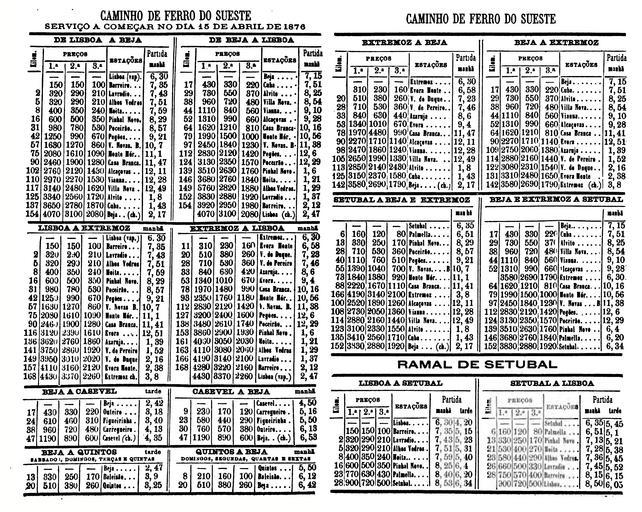 | Keywords: Horario Caminho de Ferro do Sueste 1876.jpg pt Horários da operadora estatal Caminho de Ferro do Sueste que geria todas as linhas a Sul do Rio Tejo e a travessia fluvial entre Lisboa e o Barreiro em Portugal Esta imagem foi publicada no livro As Praias de Portugal de Ramalho Ortigão de 1876 digitalizado pela Google a partir da biblioteca da Universidade de Harvard e disponibilizado pelo sítio electrónico archive org en Timetables of the CFS - Caminhos de Ferro do Sueste a state company that explored all the railway lines South of the Tagus River and the river boats from Lisbon to Barreiro in Portugal This image was originally published in the 1876 book As Praias de Portugal by author Ramalho Ortigão scanned by Google from the library of Harvard University and available in the archive org website 1876-04-15 aspraiasdeportu00pimegoog Caminho de Ferro do Sueste other versions Custom license marker 2015 11 29 Anonymous-EU Train timetables in Portugal Caminho de Ferro do Sueste Ferries in Lisbon Linha do Alentejo Linha de Évora Ramal de Moura Linha do Sul Uploaded with UploadWizard 1876 in rail transport in Portugal |