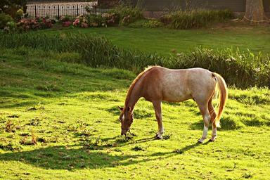 Keywords: horse animal mammal equine roan grazing garden summer horse in the garden