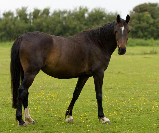 Keywords: horse beautiful animal bay brown green grass field pasture standing equine pony