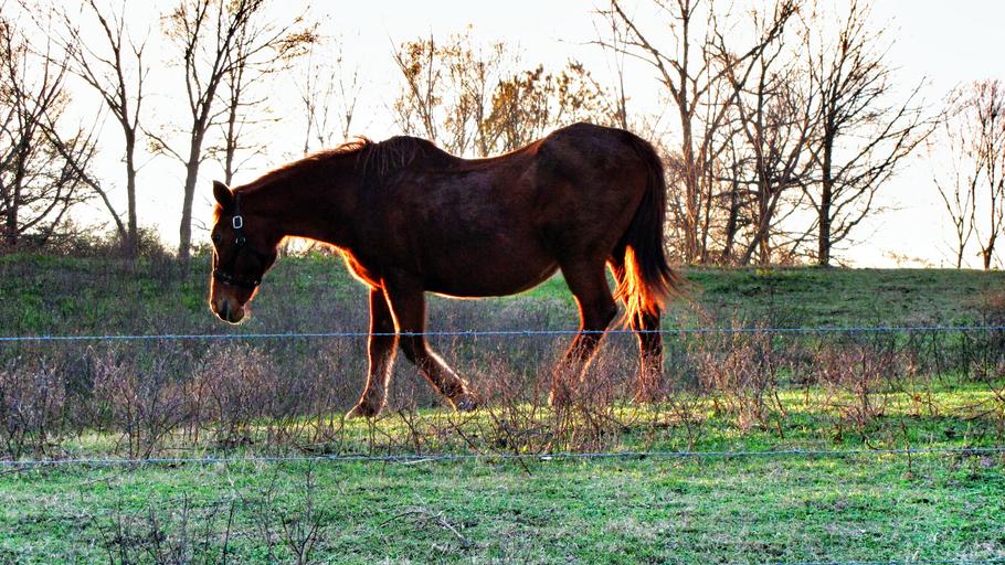 Keywords: horse brown animal mammal farm sunlight bright day domestic wildlife walking strong powerful green lawn grass trees outdoors
