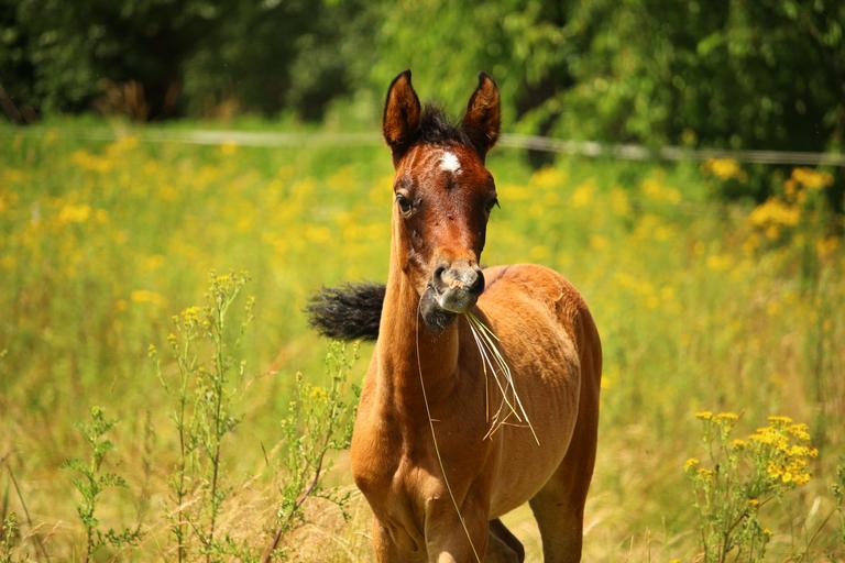 Keywords: horse foal brown mold thoroughbred arabian suckling young animal meadow pasture