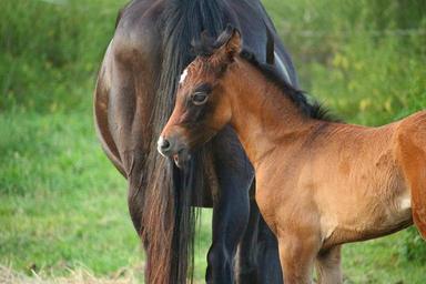 Keywords: horse foal suckling brown mold thoroughbred arabian mare pasture meadow