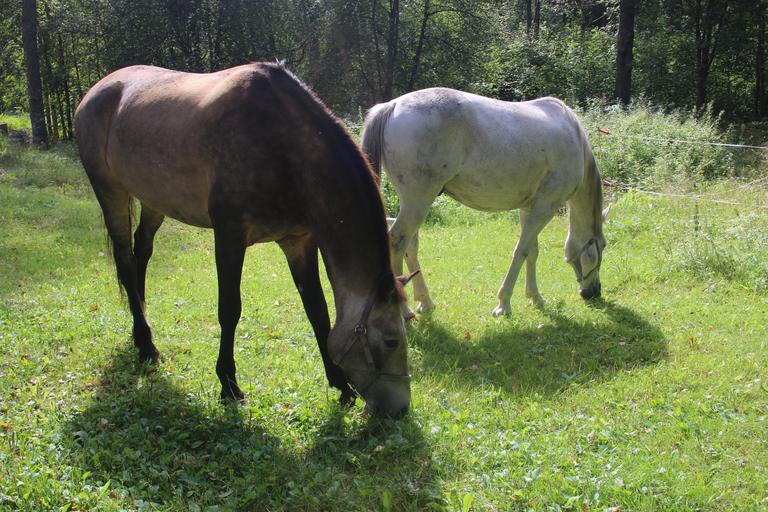 Keywords: horse horses grass white horse eating hay pasture summer brown horse countryside