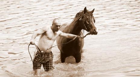 Keywords: horse man water bathroom summer