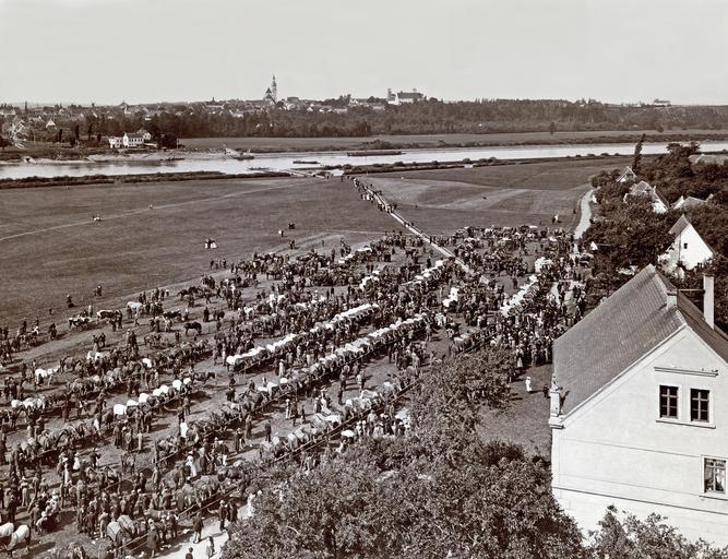 Keywords: Horse market in Lorenzkirch.jpg Ausschnitt aus dem Pferdemarkt in Lorenzkirch Gemeinde Zeithain Sachsen Deutschland Blick vom Kirchturm in Lorenzkirch zum Pferdemarkt einem Teil des Viehmarktes zur Elbe und zur Stadt Strehla Der Viehmarkt von Lorenzkirch bestand von 1690 bis 1992 er war Teil des Laurentiusmarktes Im Jahr 1859 auf dem Höhepunkt des Laurentiusmarktes standen hier 2900 Pferde zum Verkauf Vom 13 Jahrhundert bis zur Reformation blieb die Laurentiuskirche von Lorenzkirch eine Wallfahrtskirche und der Laurentiusmarkt wurde anfangs jeweils am 10 August dem Laurentiustag genannten Sterbetag des Laurentius von Rom abgehalten Der auf der Talsanddüne entstandene Ort Lorenzkirch hatte ab 1791 als Marktflecken mit seinen 1834 neu bestätigten Marktrechten eine große wirtschaftliche Bedeutung wegen des Lorenzmarktes der Pferdezüchter Viehzüchter Händler und Handwerker aus weitem Umkreis anzog In der Gegenwart wird der Lorenzmarkt als mehrtägiges Volksfest mit einem eintägigen Verkaufsmarkt begangen Pohled na část koňského trhu v saském Lozenkirchu z konce 19 století V pozadí řeka Labe a město Strehla Fotografie byla pořízena z kostelní věže v Lozenkirchu A part of the horse market in Lorenzkirch Zeithain Saxony Germany View from the church steeple in Lorenzkirch to the horse market to the river Elbe and to the town Strehla Vue partielle du marché aux chevaux de Lorenzkirch sur la commune de Zeithain en Saxe Allemagne Photo prise depuis le clocher de l'église de Lorenzkirch to the horse market Derrière le marché l'Elbe et la ville de Strehla sont visibles Scan of the photography with Epson perfection 4490 Photo Retouched image perspective adjusted and restoration of the image with Adobe Photoshop CS3 by Michael Gäbler 1891 1903 Author The File Horse market in Lorenzkirch Scan of the photography jpg is a scan of the photography without any restoration of the image Assessments c 2009 1 picture of the day 2010 08 15 51 21 17 46 N 13 14 33 16 E zoom 18_region DE PD-old-70-1923 Lorenzmarkt in Lorenzkirch History of Lorenzkirch Views of Strehla Elbe in Strehla Black and white photographs Horse markets in Germany Featured pictures of Saxony Horses of Landkreis Meißen