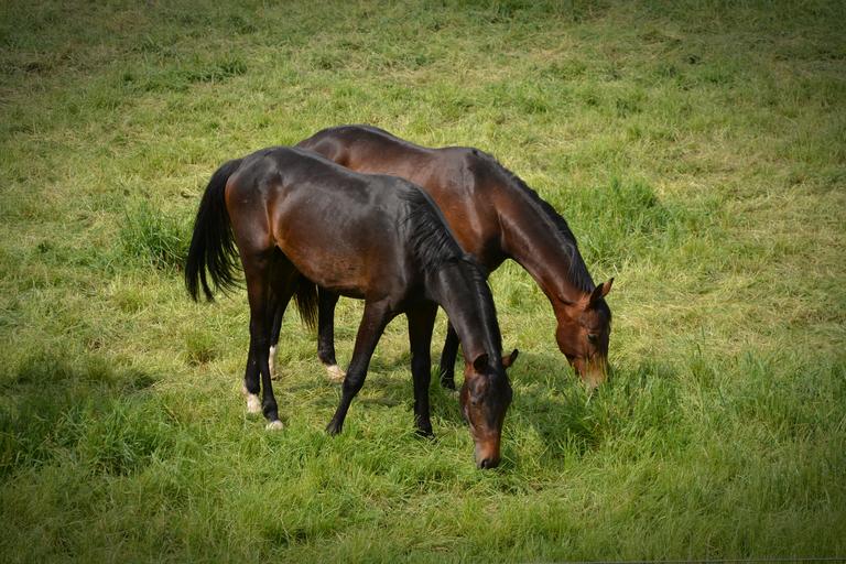 Keywords: horses flock coupling ride animals pasture brown graze wildlife mammal