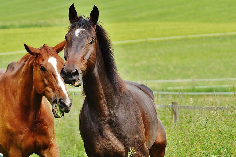 Keywords: horses for two coupling stallion eat paddock brown meadow pasture graze nature grass green play romp