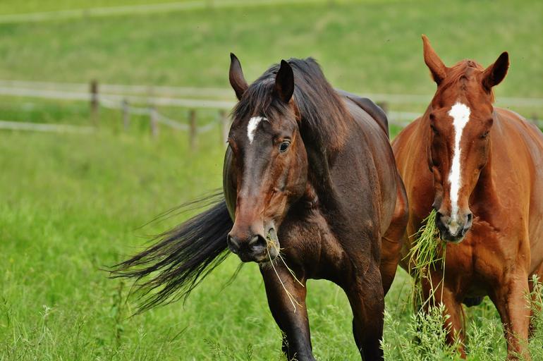 Keywords: horses for two coupling stallion eat paddock brown meadow pasture graze nature grass green play romp