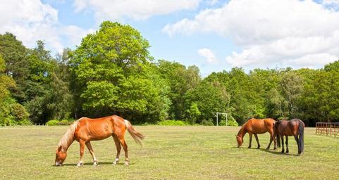 Keywords: horses pony ponies new forest pony new forest ponies chestnut brown wild herd group grazing green grass animal equine mammal outdoors countryside england hampshire landscape nature beautiful image trees scenic