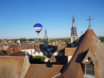 Keywords: hot-air ballooning st pourcain on sioule tile roofs blue sky bell tower