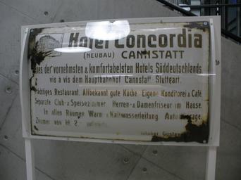 | Keywords: Hotel Concordia.jpg en Sign of the Hotel Concordia in Cannstatt place of the merger meeting of FV Stuttgart 1893 and Kronen-Klub Cannstatt de Reklameschild des Hotels Concordia in Cannstatt in dem der FV Stuttgart 1893 und der Kronen-Klub Cannstatt zum VfB Stuttgart fusionierten Aufgenommen auf der Ausstellung Mythos VfB - 100 Jahre Fusion own Yoda1893 2012-03-30 History of VfB Stuttgart Cc-zero | ||||
