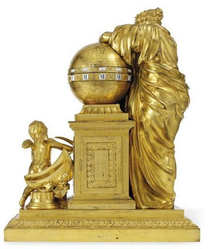 Keywords: Hôtel de Monaco – Pendule – J.-A. Lepaute (dos).jpg Jean-André Lepaute LangSwitch clockmaker horloger 1709-1789 <br> LangSwitch the figures are attributed to les sujets sont attribués à Creator Jean-Antoine Houdon LangSwitch and the composition is attributed to et la composition est attribuée à Clio jeune fille debout drapée et couronnée de lauriers pose son coude gauche sur le globe terrestre Son livre est à terre sur une colonne de temple antique brisée et une section de tronc d'arbre Le globe gravé des continents et de certains pays repose sur un piédestal qui cache les rouages accessibles par deux portes avant et arrière discrètes L'équateur est divisé en deux cercles indépendants l'un de l'autre qui tournent progressivement dans le sens horaire Sur le cercle supérieur les minutes sont inscrites en caractères arabes sur des plaques émaillées séparées par des feuilles gravées dans des cadres ovales Sur le cercle inférieur les heures sont inscrites en caractères romains jusqu'à XII séparées par des feuilles dans des losanges De l'autre côté se trouve au sol un génie du temps représenté par un putto ailé ceint d'un tissu L'ensemble est en bronze doré 1770 Technique gilt bronze Size cm 61 49 LangSwitch deep 29 cm profondeur 29 cm place of discovery object history ProvenanceEvent 1814 gift LangSwitch Chuppin de Germigny à Chuppin de Germigny a Chuppin de Germigny Paris Prince de Condé 1736-1818 Paris ProvenanceEvent acquisition Ogden Mills 1856 -1929 ProvenanceEvent 1929 inheritance Beatrice Forbes Countess of Granard 1883 “1972 Ogden Mills 1856 -1929 ProvenanceEvent 1972 inheritance langSwitch descent in the family les descendants de la famille Béatrice Forbes 1883 “1972 ProvenanceEvent 2013-07-04 sale langSwitch descent in the family of Béatrice Forbes les descendants de la famille de Béatrice Forbes Christie ™s London 1140 exhibition history credit line hoôtel de Monaco<sup>Ducamp 2012</sup> The princesse de Monaco married prince of Condé's It is now in the Château de Fontainebleau<sup>Christie ™s 2013</sup> Un exemplaire absolument identique se trouvait sur la cheminée du salon de l'hôtel de la princesse de Monaco maîtresse du prince de Condé<sup>Ducamp 2012</sup> Il se trouve actuellement au Château de Fontainebleau<sup>Christie ™s 2013</sup> <br><br>Cf chapter title D ™illustres occupants de 1774 à 1936 Hôtel de Monaco La résidence de l ™ambassadeur de Pologne à Paris 1 vol ; 30 cm 978-2-08-127528-7 Paris 2012 19-20 fr fr Ducamp <br> cite web Christie ™s A Louis XV ormulu striking pendule à cercles tournants Clio accompagnée de génie du temps http //www christies com/lotfinder/clocks/a-louis-xv-ormolu-striking-pendule-a-5698985-details aspx Christie'sarchivedate 4-7-2013 2015-03-22 Lot notes en Christie ™s accession number place of creation Paris http //www christies com/lotfinder/clocks/a-louis-xv-ormolu-striking-pendule-a-5698985-details aspx Cristie's PD-art-100 PD-old-100 Uploaded with UploadWizard Jean-André Lepaute Jean-Antoine Houdon Charles De Wailly Pendule of Hôtel de Monaco before 1838 2 |