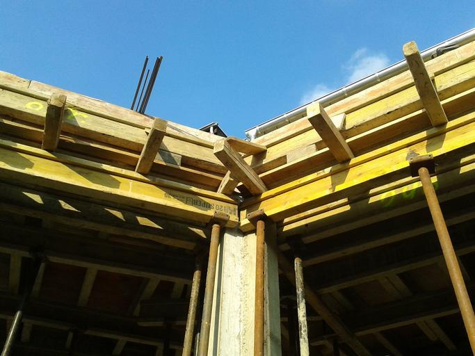 Keywords: house construction site shell formwork maurer raw bauer construction metal supports boards formwork boards iron rests scaffold scaffolding construction work masonry concrete construction planning construction craft architecture flat roof concrete ceiling