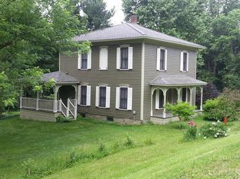 Keywords: house country home residential old two story green shutters porch rural lawn trees exterior housing