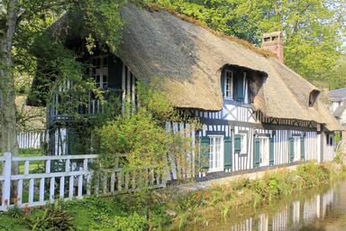 Keywords: house facade studs thatch normandy france heritage water river farmhouse
