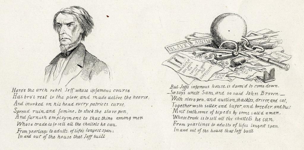 Keywords: House That Jeff Built p11-12.jpg en Panels from 1863 cartoon The House That Jeff Built by David Claypoole Johnston satirizing Jefferson Davis slavery and the Confederacy Panel 11 a caricature portrait of Jefferson Davis Here ™s the arch rebel Jeff whose infamous course has bro ™t rest to the plow and made active the hearse and invoked on his head every patriots curse spread ruin and famine to stock the slave pen and furnish employment to that thing among men whose trade is to sell all the chattels he can from yearlings to adults of life ™s longest span in and out of the house that Jeff built Panel 12 showing instruments of slavery chains slave auction notices etc lying broken in a pile with a flyer announcing Execution of Jeff Davis the Traitor But Jeff ™s infamous house is doom ™d to come down so says Uncle Sam and so said John Brown ” With slave pen and auction shackles driver and cat together with buyer and seller and breeder and that most loathsome of bipeds by some call ™d a man whose trade is to sell all the chattels he can from yearlings to adults of life ™s longest span in and out of the house that Jeff built 1863-07 1863 cartoon The House That Jeff Built by David Claypoole Johnston David Claypoole Johnston other versions PD-old-70-1923 The House That Jeff Built z Caricatures of Jefferson Davis |