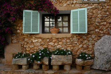 Keywords: house window window shutters picturesque house facade style stone wall old decor flowers