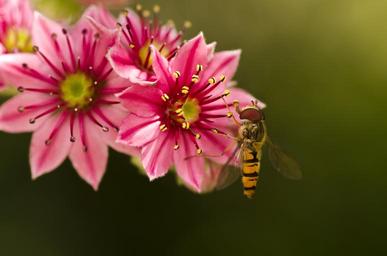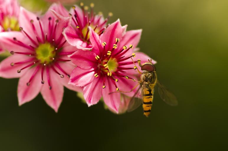 Keywords: hoverfly houseleek garden blossom bloom pink mimicry insect