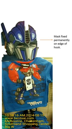 Critic: What if the customer did not notice the mask on the back of the shirt? Ans: It would be a surprise if anyone bought a shirt simply by viewing from the front without measuring the child or trying the shirt on? When they do try the shirt on, they will discover the mask. It would be a pleasant surprise to find the mask free of charge at the cashier. A signage would be helpful?