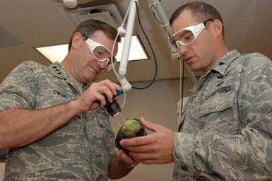 Keywords: How to Use a Carbon dioxide Fractional Laser in the Dermatology.jpg U S Air Force Lt Col Chad Hivnor right a doctor and the associate director of dermatology with the 59th Medical Wing uses an eggplant to show Lt Gen Douglas Owens the vice commander of Air Education and Training Command how to use a carbon dioxide fractional laser in the dermatology department at Wilford Hall Medical Center on Lackland Air Force Base Texas Oct 1 2010 Owens was visiting Airmen with the wing for the first time since becoming vice commander of the command DoD photo by Staff Sgt Robert Barnett U S Air Force/Released 2010-10-01 12 30 46 https //www flickr com/photos/39955793 N07/5054774730/ U S Department of Defense other versions PD-USGov Dermatology |