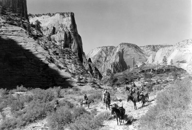 | Keywords: west virginia westvirginia united states of america unitedstatesofamerica blackandwhite monochrome outdoor black and white Horseback party on East Rim Trail, Zion National Park, September 12, 1929. National Park Service photograph by George A. Grant: Negative Number ZION Wa. 410 Horseback party on East Rim Trail, Zion National Park, September 12, 1929. National Park Service photograph by George A. Grant: Negative Number ZION Wa. 410 | ||||