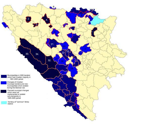 Keywords: Hrvatske opcine u BiH.png 1 Zavalje Croats villages in Bihać municipality Claimed as part of Croatia in the border talks was Croatia until unilateral change in 1947 controled by HVO during Bosnian war HDZ suggested new municipality 2 Ljubija ex Croat municipality abolished in the 60-ies slightly different borders planed as new municipality in the early stages of Bosnian war 3 Sasina planed as new municipality in the early stages of Bosnian war 4 Ivanjska ex Croat municipality abolished in the 60-ies slightly different borders planed as new municipality in the early stages of Bosnian war 5 Kotor Varoš planed as new municipality in Bosnian war claimed by Croatian community of Herzeg Bosna during the war controled by Croat forces in the early stages of Bosnian war planed as new municipalities in later stages of Geneva peace conference 6 Gradiška Croatian villages planed as new municipality in the early stages of Bosnian war 7 Derventa old borders of municipality during the war referendum was held in north Doboj villages Croatian parties won first municipal ellections most of the territories was controled by Croatian forces in early stages of Bosnian war Changes of municipal borders discussed during Geneva peace conference claimed by Croatian community of Herzeg Bosnia during the war 8 Modriča Croatian parties won first municipal ellections most of the territories was controled by Croatian forces in early stages of Bosnian war Discussions of municipal borders made during the Geneva peace conference southern line shown is the line proposed in the Contact group peace plan claimed by Croatian community of Herzeg Bosnia during the war 9 Šamac Croatian parties won first municipal ellections most of the territories was controled by Croatian forces in early stages of Bosnian war Discussions of municipal borders made during the Geneva peace conference claimed by Croatian community of Herzeg Bosnia during the war 10 Croatian villages in Prnjavor/Doboj brief Croatian control in early stages of Bosnian war 11 Croatian villages near Usora Croatian control in stages of Bosnian war border discussed during Geneva peace conference 12 Oštra Luka Croatian village near Orašje part of municipality in vich Croatian parties won first municipal elections controled during the war by Croatian forces most of the war until the end was part of Croatian municipality in every peace plan except last one claimed by Croatian community of Herzeg Bosnia during the war 13 Tramošnica collection of Croatian villages in 1991 municipality of Gradačac and neighbouring municipalities Controled by Croatian forces in early phases of Bosnian war borders discussed during Geneva peace conference claimed by Croatian community of Herzeg Bosnia during the war 14 Ravne-Brčko part outside District of Brčko territories controled by Croatian forces during Bosnian war borders discussed during Geneva peace conference Croatian parties planed new municipality in Federation 15 Soli Croatian villages around Tuzla Croatian parties planed new municipality in Federation claimed by Croatian community of Herzeg Bosnia during the war 16 Komušina territories controled by Croatian forces during Bosnian war borders discussed during Geneva peace conference claimed by Croatian community of Herzeg Bosnia during the war 17 Žepče territories controled by Croatian forces during Bosnian war borders discussed during Geneva peace conference municipal borders changed affter 1995 maximal Croatian claim not met claimed by Croatian community of Herzeg Bosnia during the war 18 Vareš territories controled by Croatian forces during Bosnian war borders discussed during Geneva peace conference Croatian parties planed changed borders of municipality in Federation claimed by Croatian community of Herzeg Bosnia during the war 19 Kraljeva Sutjeska territories controled by Croatian forces during Bosnian war borders discussed during the war Croatian parties planed new municipality in Federation 20 Travnik territories controled by Croatian forces during Bosnian war border changes discussed during the Geneva peace conference and after by Washington agreement Travnik should have had the same status as Mostar claimed by Croatian community of Herzeg Bosnia during the war 21 Jajce territories controled by Croatian forces during Bosnian war border changes discussed during the Geneva peace conference and after claimed by Croatian community of Herzeg Bosnia during the war Croatian parties won first municipal elections Border shows reunification of prewar Jajce municipality with Dobretići and few Croatian villages in Mrkonjić Grad Matjaševo 22 Novi Travnik territories controled by Croatian forces during Bosnian war border changes discussed during the Geneva peace conference and after claimed by Croatian community of Herzeg Bosnia during the war Croatian parties won first municipal elections Borders shows enlargment of Novi Travnik by few Croatian villages in Fojnica and Bugojno municipalities 23 Vitez territories controled by Croatian forces during Bosnian war border changes discussed during the Geneva peace conference and after claimed by Croatian community of Herzeg Bosnia during the war Croatian parties won first municipal elections Border shows enlargment of Vitez by few Croatian villages in Zenica municipality 24 Fojnica controled by Croatian forces during Bosnian war border changes discussed during the Geneva peace conference and after claimed by Croatian community of Herzeg Bosnia during the war Croatian parties won first municipal elections 25 Kiseljak controled by Croatian forces during Bosnian war border changes discussed during the Geneva peace conference and after claimed by Croatian community of Herzeg Bosnia during the war Croatian parties won first municipal elections Border shows enlarment of municipality by few Croatian villages in Visoko municipality 26 Uskoplje controled by Croatian forces during Bosnian war border changes discussed during the Ge