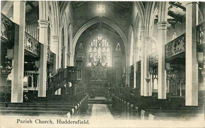 | Keywords: Huddersfield Parish Church 007.jpg en 1906 postcard showing interior of Huddersfield Parish Church - Kirkgate Huddersfield West Yorkshire England Addressed to Miss Chilwell at Sutton House Shifnal Shropshire Postmarked 27 April 1906 My own scan of original postcard in my possession Individual photographer unknown and anonymous Records archives and postcard books have been searched for author and any copyright claim but none found PD-old-70-1923 Postcards of St Peter's Church Huddersfield Archive images of Church of St Peter Huddersfield |