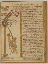 Keywords: Hueymiccaihuitl, Great Feast of the Dead, the Tenth Month of the Aztec Solar Calendar WDL6739.png Artwork ru Това Хуан де около 1546 г около 1626 г fr Tovar Jean de 1546-1626 env en Tovar Juan de circa 1546-circa 1626 zh 胡安·德·托瓦尔,约 1546 年 - 约 1626 年 pt Tovar Juan de por volta de 1546-por volta de 1626 ar خوان دو توفار، حوالي 1546-حوالي 1626 es Tovar Juan de circa 1546-circa 1626 ru Уэймиккаиуитль большой пи ме твых 10-й месяц солнечного календа я ацтеков fr Hueymiccaihuitl grande fête des morts dixième mois du calendrier solaire aztèque en Hueymiccaihuitl Great Feast of the Dead the Tenth Month of the Aztec Solar Calendar zh 阿兹特克太阳历的第 10 个 亡 大宴 pt Hueymiccaihuitl Grande festa dos mortos o décimo mês do calendário solar asteca ar ويميكايويتل، عيد الموتى العظيم، الشهر العاشر من التقويم الشمسي الأزتكي ru Кодекс Това а авто ом кото ого считается мексиканский иезуит XVI века Хуан де Това соде жит под обную инфо мацию об об ядах и це емониях ацтеков известных также как мешика Кодекс п оиллюст и ован 51 аква ельным исунком на полную ст аницу Рисунки в кото ых наблюдается значительное влияние пиктог афических укописей доколониальных в емен обладают исключительными художественными достоинствами Рукопись состоит из т ех азделов В пе вом азделе описана исто ия путешествий ацтеков до п ибытия испанцев Вто ой аздел п едставляет собой иллюст и ованную исто ию ацтеков В т етьем азделе находится календа ь Това а в кото ом п ослеживается календа ный цикл ацтеков с месяцами неделями днями воск есными буквами и елигиозными п аздниками х истианского 365-дневного года а этой иллюст ации из т етьего аздела изоб ажены два мальчика взби ающиеся на шест а ве ху шеста находятся щит с белыми пе ьями копья флаги на отдельных шестах из кактусов два цветка ве оятно <em>xocoxochitl</em> и два аздвоенных п едмета ве оятно <em>teocuitlanacochtli</em> ад шестом на исованы голова птицы с семечкой в длинном клюве ка авай посыпанный све ху о ехами и напоминающий звездное небо початок куку узы и какой-то т апециевидный п едмет В тексте указано что то жество отмечалось тепанеками Этот месяц называется уэймиккаиуитль или шокотлуэци падение плодов или большой пи ме твых В п азднество входило итуальное со евнование в лазании по шесту есяц был посвящен Шокотлю ацтекскому богу огня и звезд также именуемому Отонтекутли чей культ больше всего был асп ост анен с еди племен тепанеков Teocuitlanacochtli также относятся к культу бога Шипе Тотека <br>Календа ь ацтеков; Боги ацтеков; ифология ацтеков; Ацтеки; Календа и; Кодекс; Индейцы ексики; Ко енные на одности; езоаме ика; Кодекс Това а fr Le codex Tovar attribué à Jean de Tovar jésuite mexicain du XVI<sup>e</sup> siècle contient des informations détaillées sur les rites et les cérémonies des Aztèques également connus sous le nom de Mexicas Il est illustré de 51 aquarelles de la taille d'une page Fortement influencées par les manuscrits pictographiques de la période précontact ces peintures sont d'une qualité artistique exceptionnelle Le manuscrit est divisé en trois sections La première section contient une histoire des voyages des Aztèques avant l'arrivée des Espagnols La deuxième section est une histoire illustrée des Aztèques Dans la troisième section le calendrier de Tovar transcrit un calendrier aztèque continu avec les mois les semaines les jours les lettres dominicales et les fêtes liturgiques d'une année chrétienne de 365 jours Cette illustration extraite de la troisième section représente deux garçons grimpant à un poteau Le sommet du poteau est composé d'un bouclier orné de plumes blanches de lances d'étendards sur des bâtons en dents de scie fait de cactus de deux fleurs vraisemblablement du <em>xocoxochitl</em> et de deux objets se divisant en deux peut-être des <em>teocuitlanacochtli</em> L'image inclut également au-dessus du poteau la tête d'un oiseau avec une graine dans son long bec une miche de pain parsemée de noix et semblable à une nuit étoilée un épi de maïs ainsi qu'un objet en forme de trapèze Le texte décrit cette fête comme celle des Tépanèques Ce mois est appelé Hueymiccaihuitl ou Xocotlhuetzi chute des fruits ou grande fête des morts Il était commémoré par une cérémonie pendant laquelle une compétition d'escalade de poteau avait lieu Ce mois était dédié à Xocotl dieu aztèque du feu et des étoiles égalem
