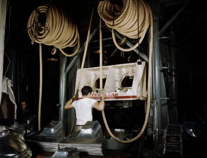 | Keywords: Huge drop hammers work day and night forming sheet metal parts for United Nations bombers and fighters at the North American Aviation plant, Inglewood, Calif.jpg North American Aviation Inc plant Inglewood Calif The heavy hemp rope is used to snub the hammer so that it forms the part under proper pressure and rises clear of the work after each operation LOC-image fsac 1a35315 Creator Alfred T Palmer 1942-10 PD-USGov Men at work in California Photographs by Alfred T Palmer at North American Aviation Inc plant in Inglewood Calif 1942 Oct Presses Sheet metal Hemp ropes Photographs by Alfred T Palmer California |